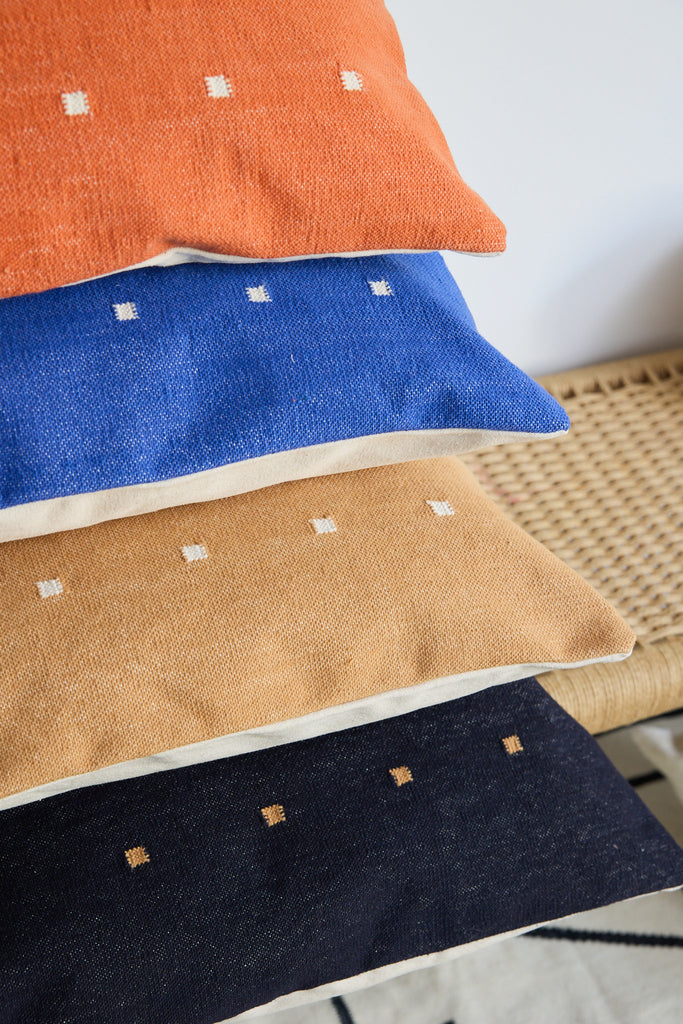 This geometric throw pillow has been ethically hand woven by artisans in Rajasthan, India, using a traditional weaving technique which is native to this region.