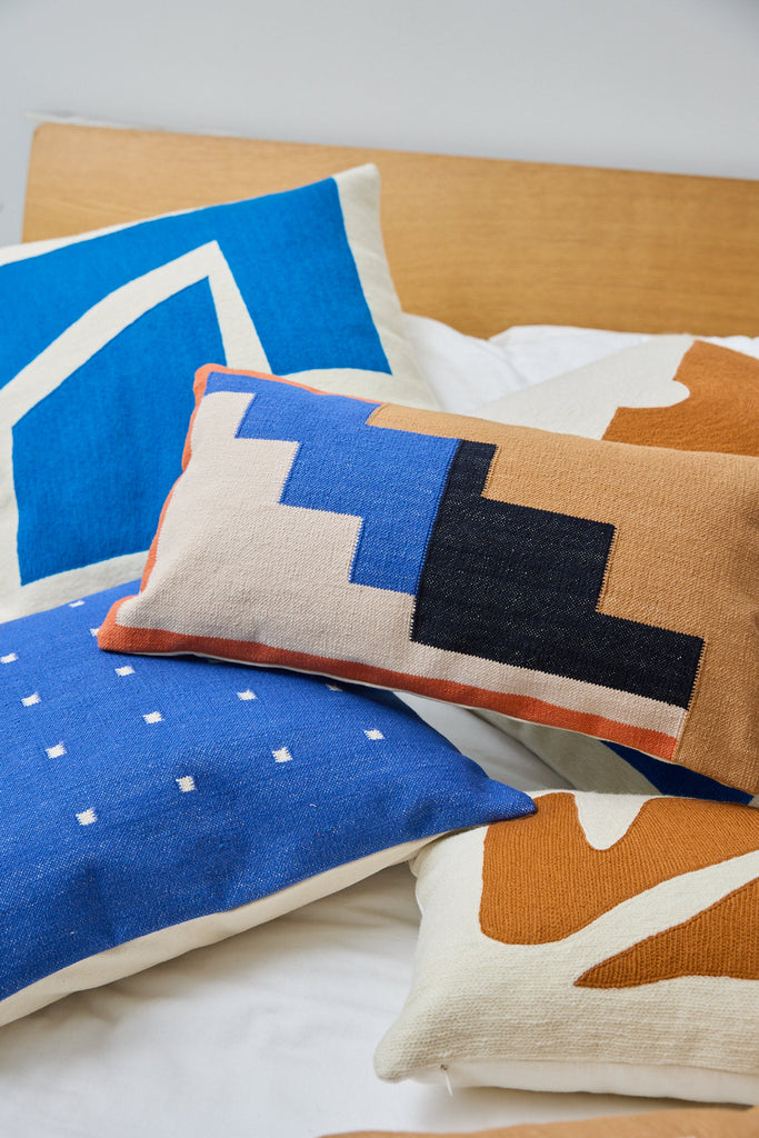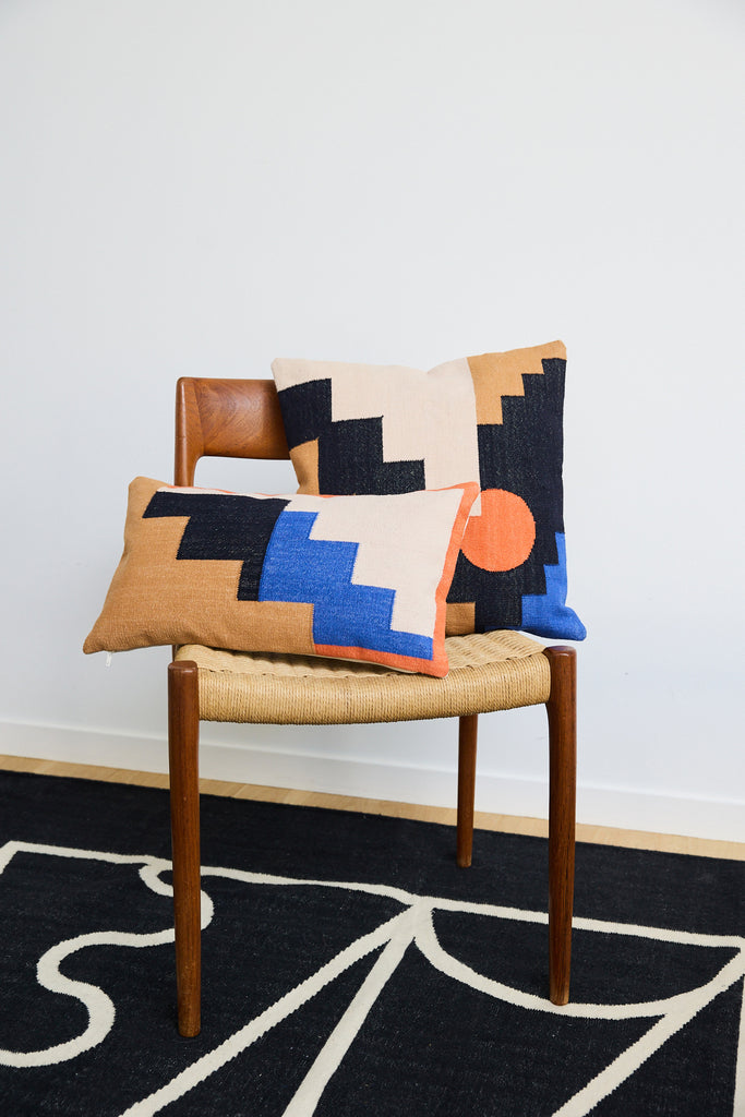 This geometric throw pillow has been ethically hand woven by artisans in Rajasthan, India, using a traditional weaving technique which is native to this region.