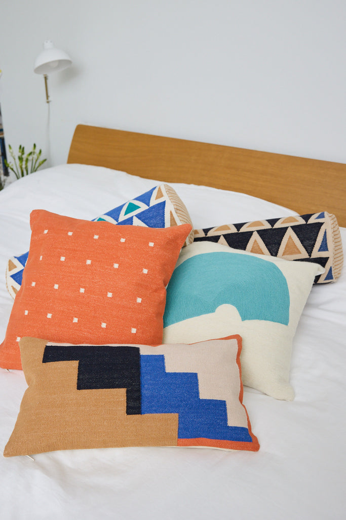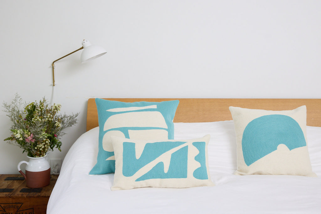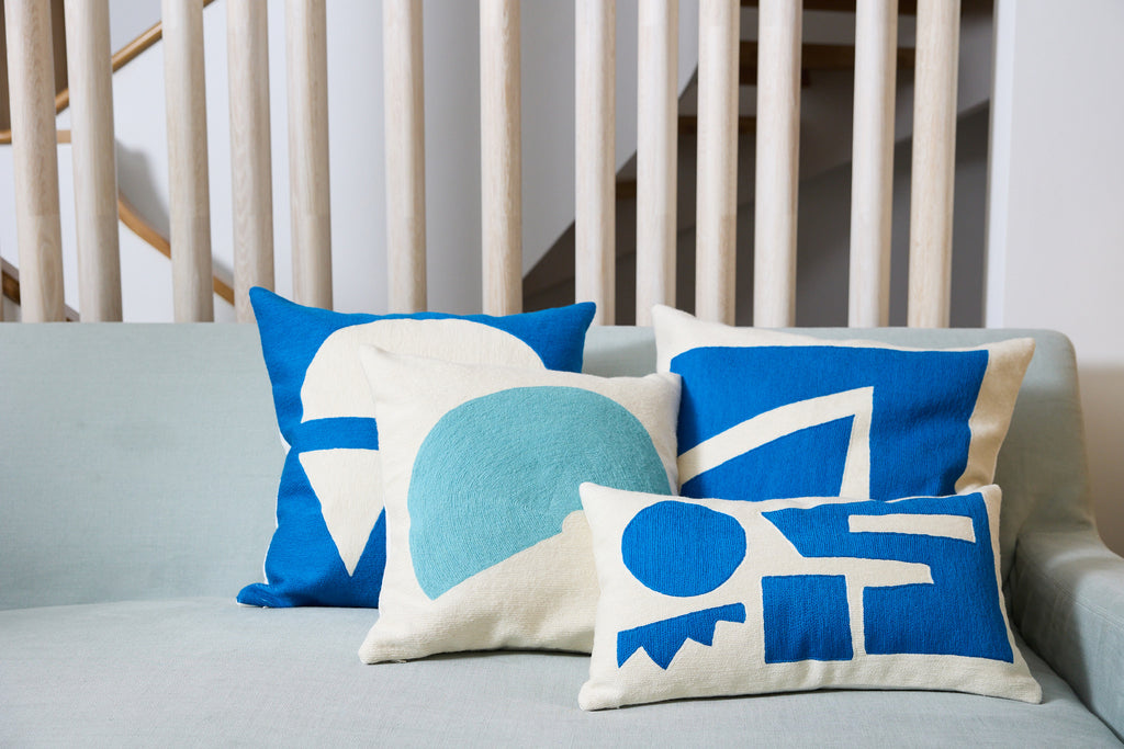 These geometric throw pillows have been ethically hand embroidered by artisans in Kashmir, India, using a traditional embroidery technique which is native to this region.