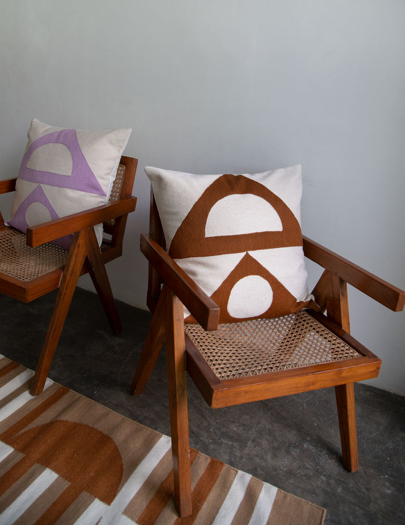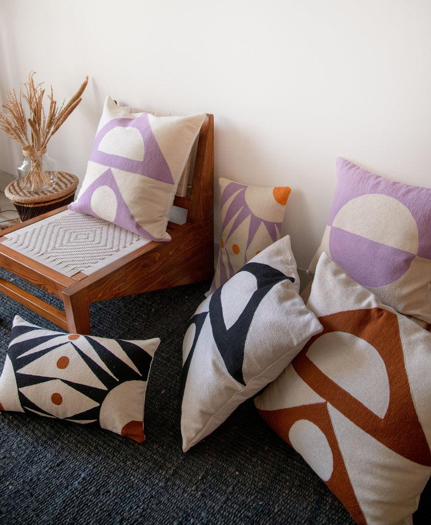 This geometric throw pillow has been ethically hand embroidered by artisans in Kashmir, India, using a traditional embroidery technique which is native to this region.